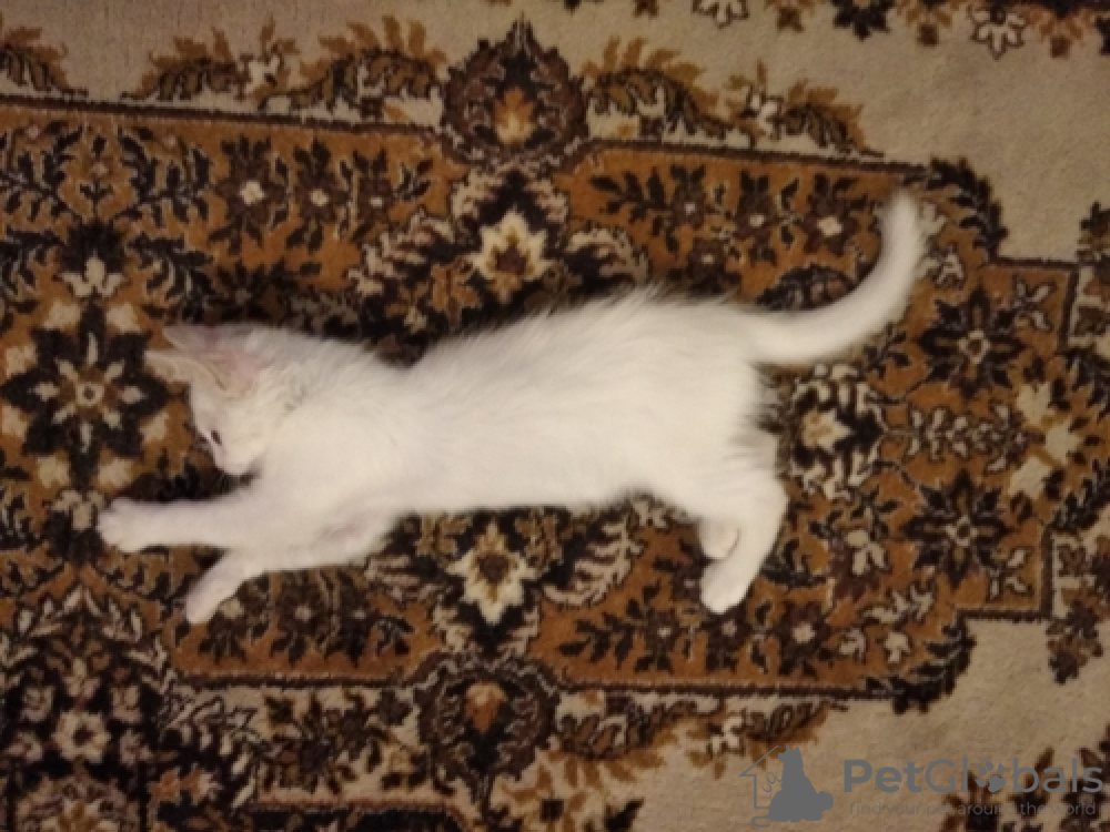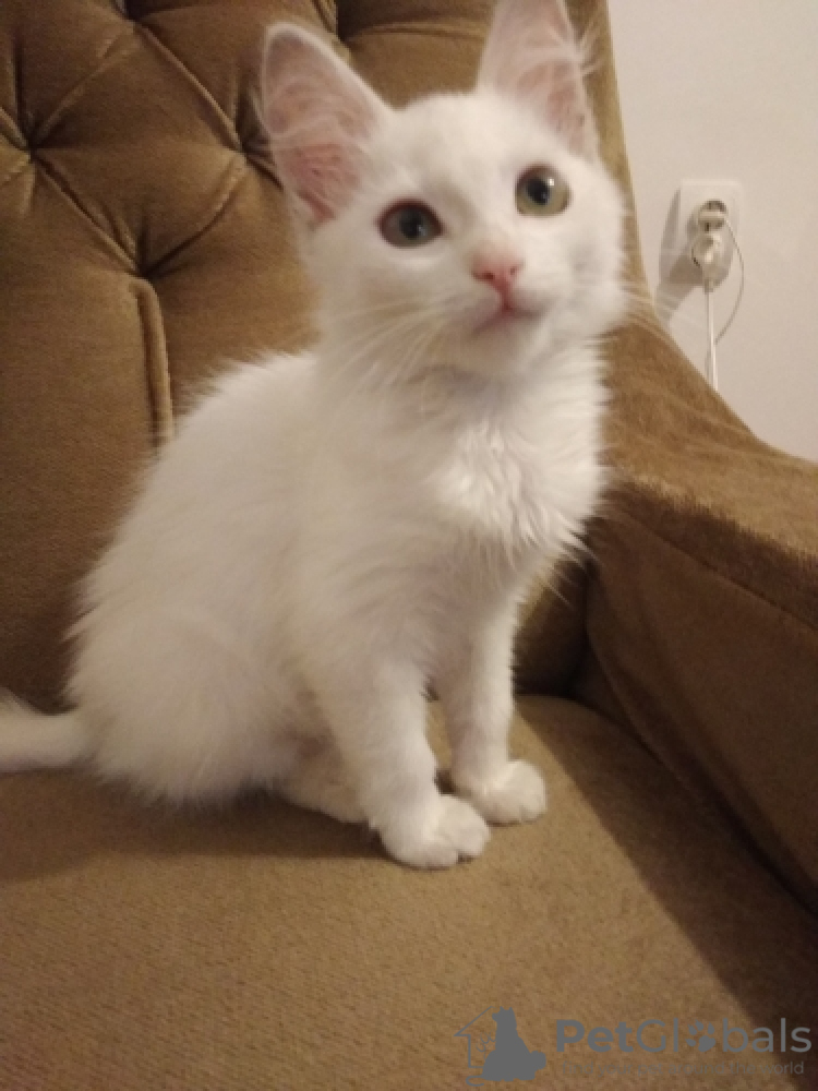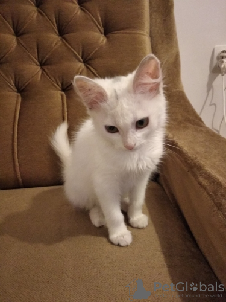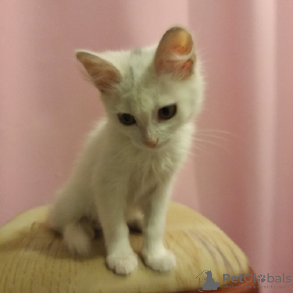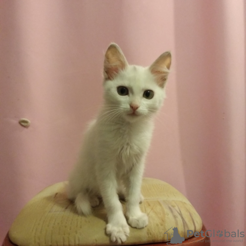Кошечка белая, глаза светло-зеленые, характер любознательный, очень подвижная, ласковая, чистоплотная, приучена к туалету, проглистована. Не боится собак. Вырастет и станет элегантной красавицей!