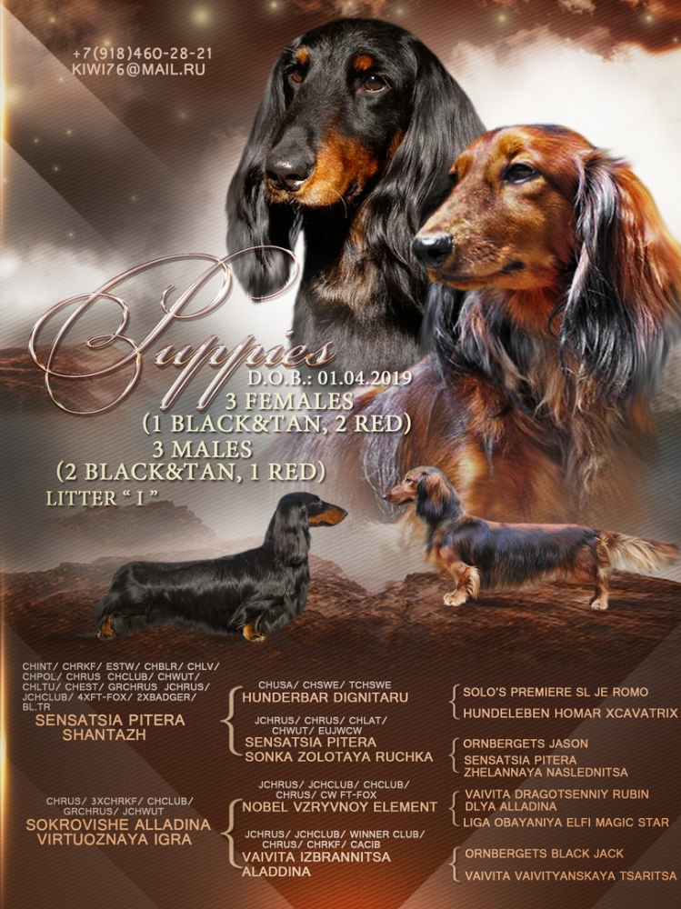 мать: Юный Чемпион Мира такс, Чемпион России, Чемпион НКП, Гранд Чемпион России, 3х Чемпион РКФ