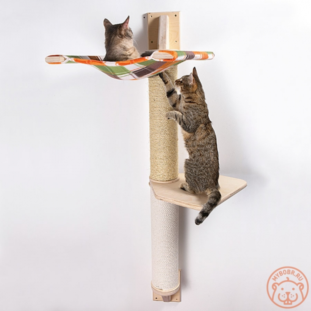 Комплекс "Токио 2" прочно и надежно крепится к стене (крепеж поставляется в комплекте). Все элементы соединяются между собой стальной шпилькой диаметром 8 мм и закладными металлическими гайками, расположенными внутри труб-когтеточек. Элементы полки гамака изготовлены из дополнительно отшлифованной фанеры толщиной 20 мм. Когтеточки могут быть выполнены из хлопкового, джутового или сизалевого каната по вашему выбору. Гамак сшит из двух слоев мягчайшего флиса – вы можете выбрать любую расцветку. Также, по вашему желанию, все деревянные элементы могут быть покрыты специальным мебельным маслом различных оттенков.